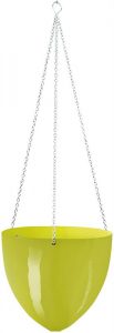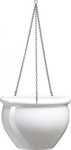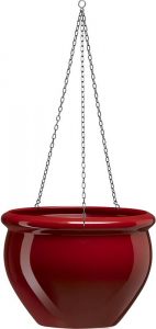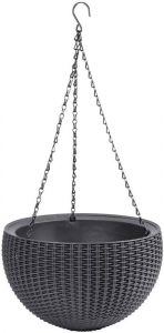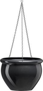 Esta maceta tiene forma semicircular y tres cadenas para que se sujete con fuerza al momento de colgarla. Su gancho es de color grafito y su diseño es elegante lo que la convierte en un complemento ideal para tu jardín.